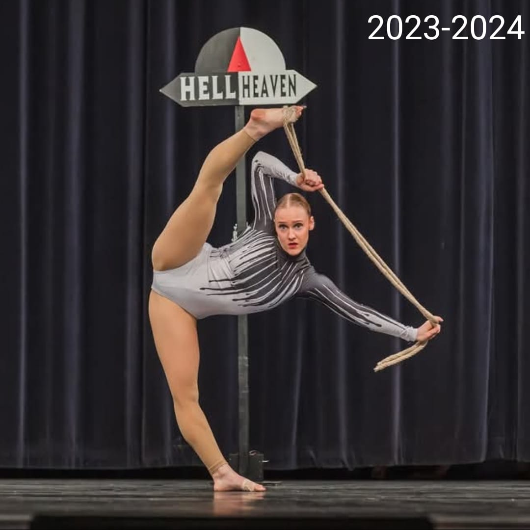 2023-2024: 'Heaven or hell'. Ze staat voor een keuze: hemel of hel, maar plots sluiten de deuren van de hemel & beland je in de hel. Wat dan? Verder hebben we dit seizoen een acro dans ‘Survivor’ waarbij we een prachtige ZILVERE medialle haalde op het WK .